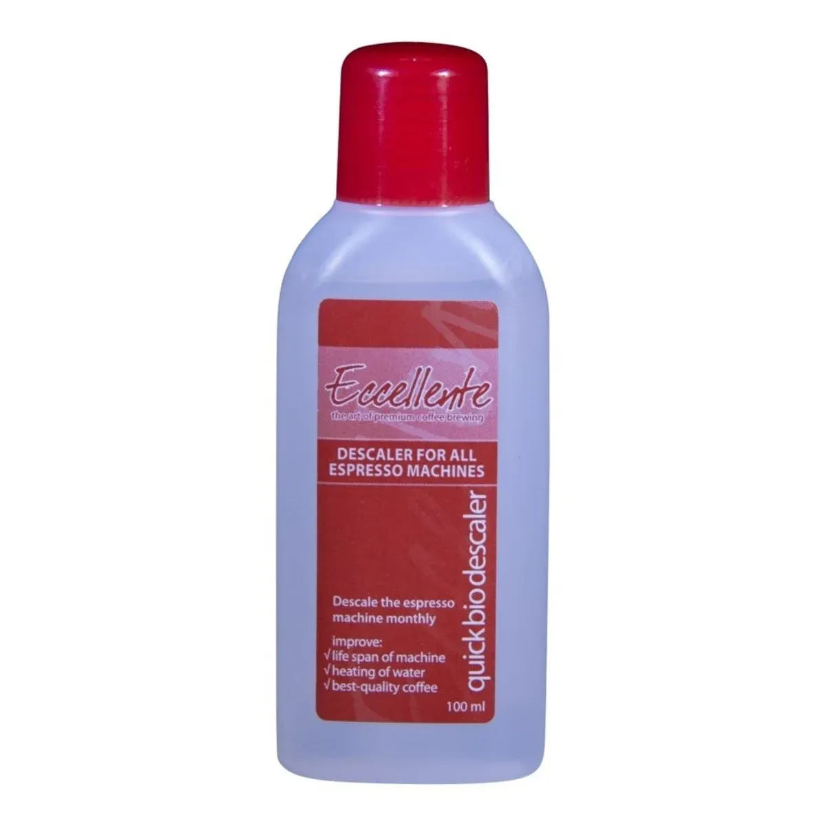 Eccellente Quick Bio Descaler is a strong descaling product, the liquid contains less water than other descalers. Therefor you need only 100 ml Eccellente Quick Bio Desclaler and a larger amount of water than usual descalers. The bottle looks small but is more powerful than other descaling products for coffee machines.